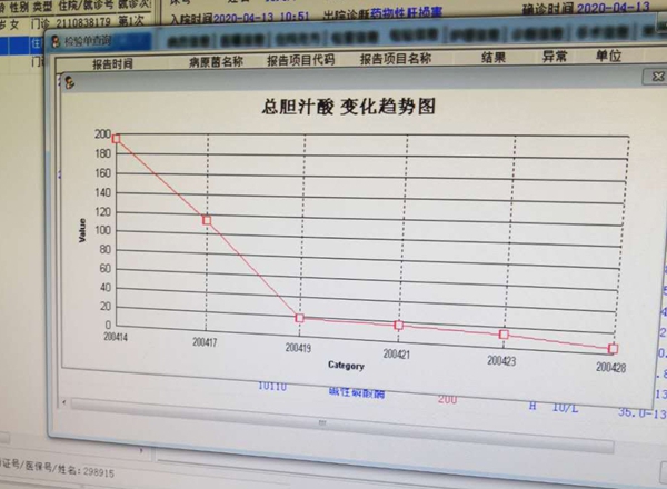 说明:总胆汁酸,具有参与脂肪消化吸收的作用,这项指标能反映肝细胞合成、摄取及分泌功能。患者巩女士第1次的总胆汁酸指标是194.4,是正常参考值上限的19倍,属于病理性升高。