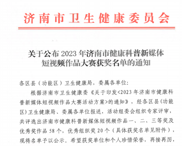 2023年5月,山东省卫健委、济南市卫健委发布了“关于公布2023年健康科普新媒体短视频作品大赛获奖名单的通知”,济南市中心医院参赛选手获得省级三等奖1人,市级一等奖、三等奖、优秀奖6人,参评作品是2022年3月--2023年5月底期间在新媒体平台上公开上传发布的,短视频且与健康科普相关的作品。济南市中心医院主治医师王福获奖作品“自己在家中如何正确测量血压”,以其专业性、准确性、实用性,打动了省级评委。